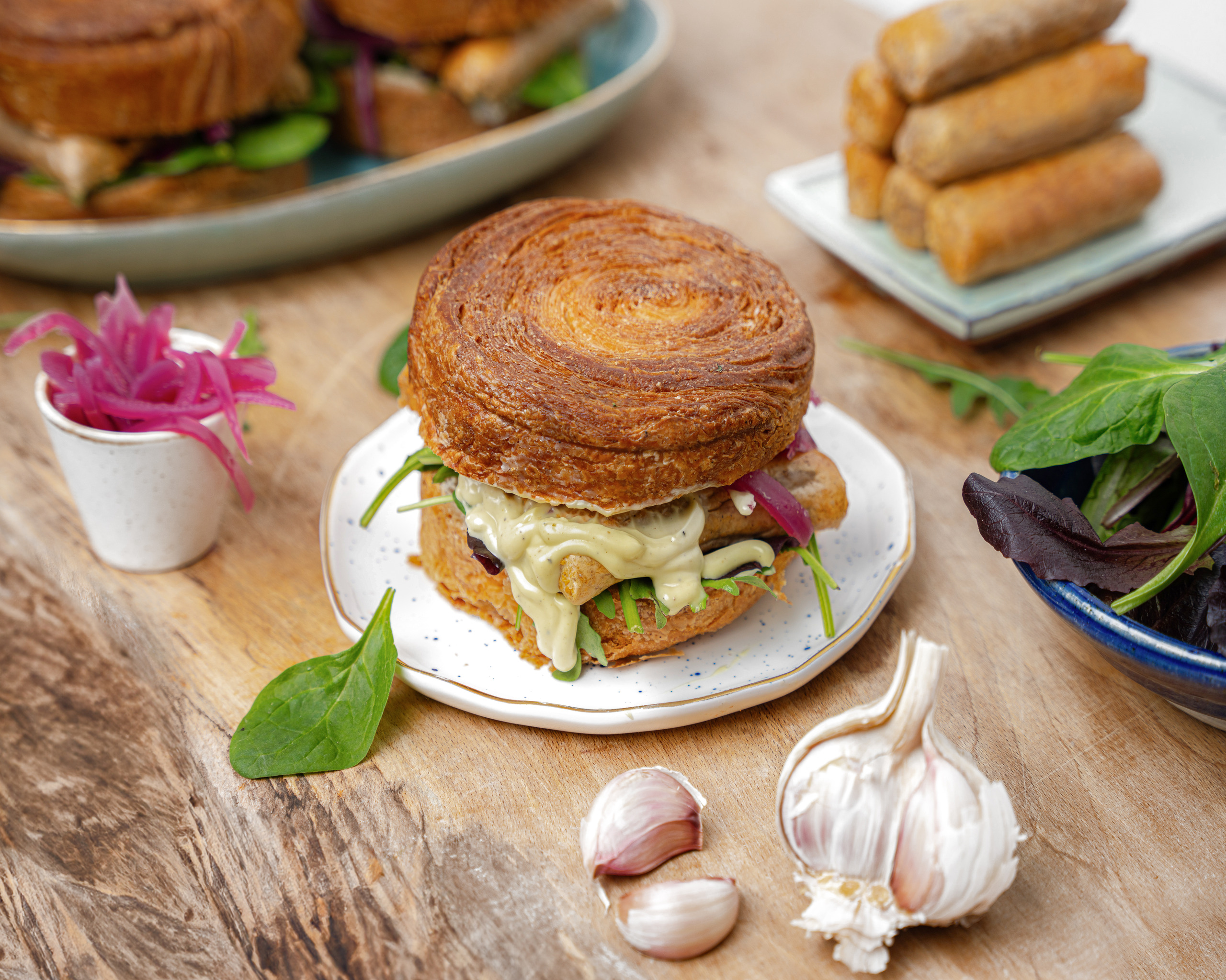 Introducing our tantalizing vegan croll with savoury vegan sausage, generously adorned with aromatic garlic butter and rocket leaves. Indulge in this irresistible vegan treat that promises a symphony of flavors in every bite. Perfect for those craving a deliciously satisfying, vegan delight any time of day!