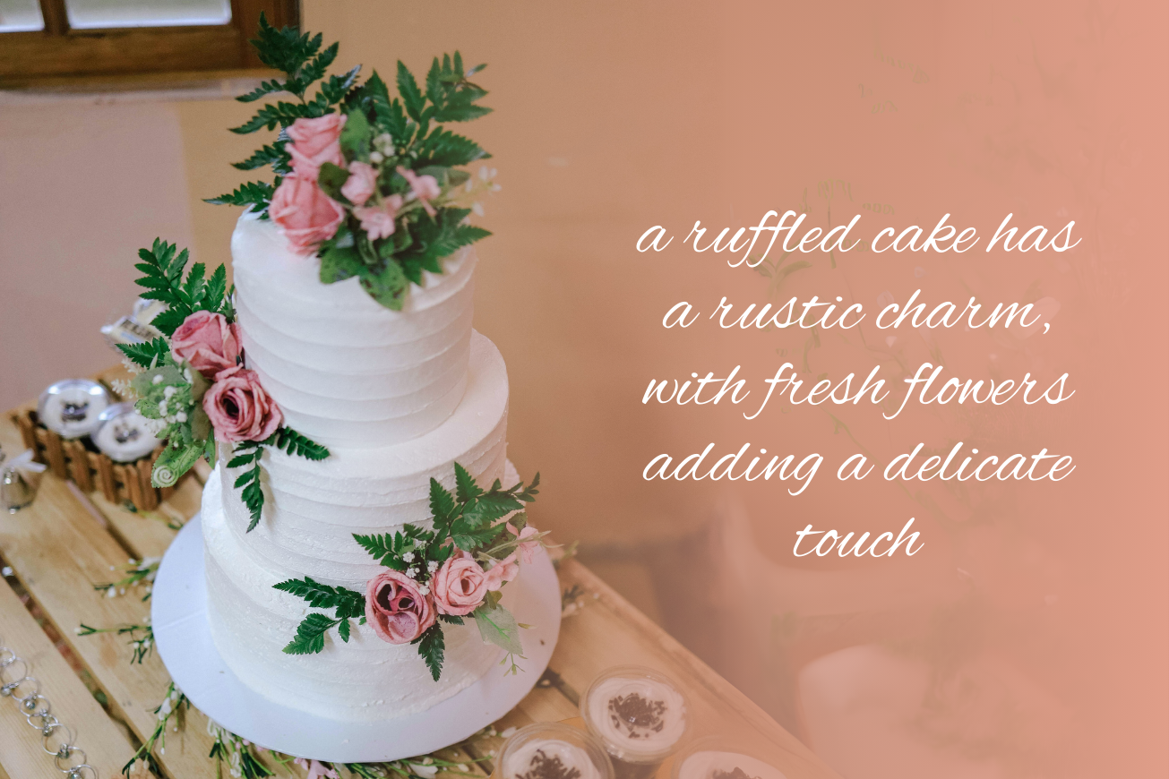 Ruffled wedding cake is a sophisticated and luxurious choice for your special day. This cake boasts an exquisite buttercream finish, giving it a rich and elegant appearance.