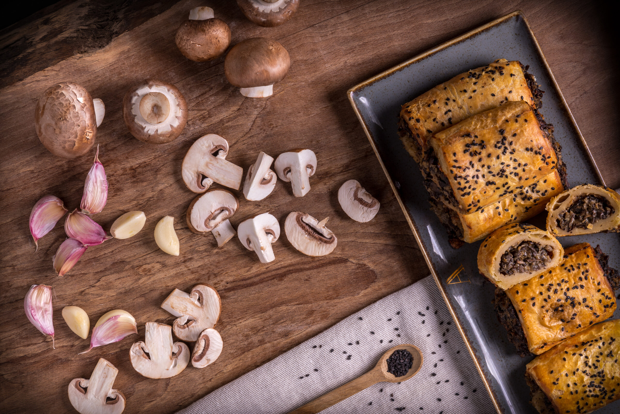 One of the best sellers from our vegan savoury products. A delicious mushroom filling wrapped in our homemade vegan wholemeal puff pastry. Made from all natural ingredients and topped with black sesame seeds, best served warm.